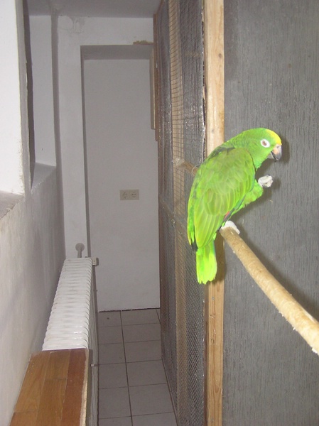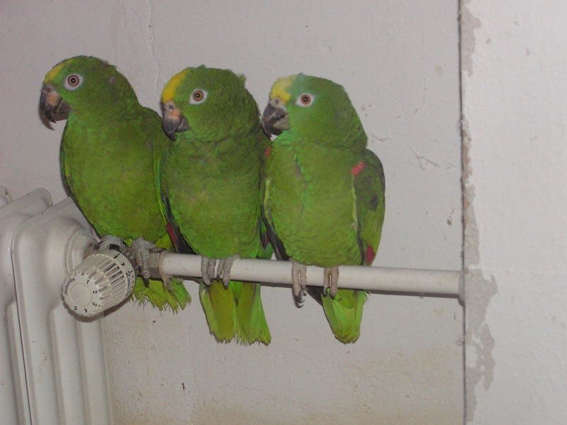 Einen beliebten Rückzugsplatz zeigt das nachstehende Bild.Der Heizkörper befindet sich hinter einer freistehenden Voliere, zusammen mit der Wand entsteht hier ein Gang mit etwa 0.5 Meter Breite. Gedacht war er eigentlich dazu, Heizkörper und Volierenrückseite für Reinigungsarbeiten zugänglich zu machen. Der Gang hat sich inzwischen aber auch als Fluchtweg bei Verfolgungsjagden auf dem Boden und eben wie im Bild zu sehen als Rückzugsraum, noch dazu mit geheizter Sitzstange, bewährt (siehe nachstehendes Bild). Zu heiß wird es den Vögeln hier nicht, denn der Heizkörper wird durch das Thermostatventil nur auf etwa 25 bis 30 °C (Die Raumtemperatur beträgt im Winter etwa 14 °C) gehalten. Des öfteren haben sich die Vögel auch schon auf dem Heizkörper selbst niedergelassen, was in der Regel ziemlich aufwendige Reinigungsarbeiten nach sich zog. Ein Sitzbrett auf dem Heizkörper schaffte hier weitgehend Abhilfe.