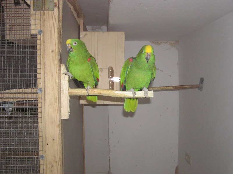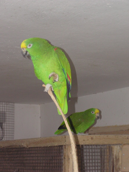 Ideal für Paare in einer Gruppenhaltung ist ein Hängekäfig dessen Vorderfront (siehe Bild) wie eine Türe vollständig geöffnet werden kann. Bei geöffneter Vorderfront ist der Hängekäfig ein öffentlich zugänglicher Raum der von allen Vögeln genutzt werden kann. Bei geschlossener Vorderfront ist es dagegen ein ganz privater Platz für das Paar das hier wohnt, auf dem Bild sitzt es oben links. Ein wesentlicher Faktor für eine erfolgreiche Gruppenhaltung sind sichere Plätze für Einzelvögel oder Paare, die noch über kein "Eigenheim" verfügen. Diese Plätze sollten nicht mehr Platz bieten als unbedingt erforderlich und so positioniert sein, dass sie schlecht angreifbar sind. Amazonen greifen Artgenossen ja gerne dadurch an, dass sie diese mit vollem Tempo anfliegen und sie mit ausgefahrenen Beinen vom Sitzplatz stoßen. Ein Platz der nicht mit hohem Tempo angeflogen werden kann, schließt solche Angriffe aus und ist dementsprechend ein gefragter Ruheplatz.