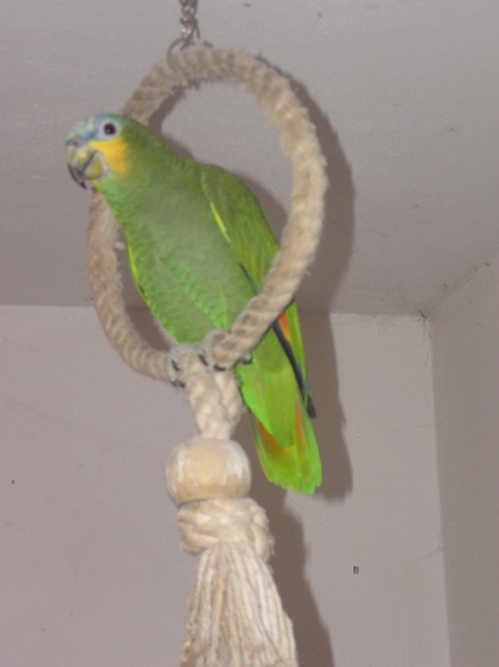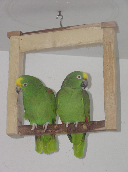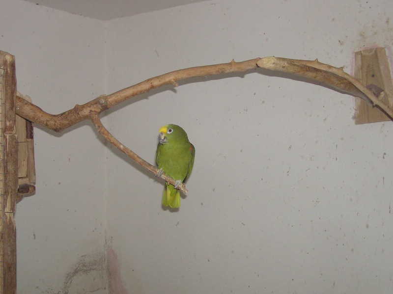 Die nachstehenden Bilder zeigen weitere bewährte Sitzplätze, im Bild links eine Sitzstange für Paare. Da die Sitzstange abseits der Hauptflugschneise liegt, kann sie auch nicht direkt mit vollem Schwung angeflogen werden. Sie ist daher ein sicherer und dementsprechend beliebter Platz. Dazu trägt auch die Tatsache bei, dass sie aus einem Weidenast besteht. Gerne machen die Amazonen von der Möglichkeit Gebrauch, den Ast auf dem sie sitzen zwar nicht abzusägen aber doch abzunagen, er muß daher regelmäßig erneuert werden. Dies stellt kein Problem dar, denn Halterung und Ast sind verschraubt. Weitere bew&aunl;hrte Sitzgelegenheiten zeigen die Bilder in der Mitte (selbstgebaute Schaukel aus Rund- und Kanthölzern), sowie den altbewährten Seilring der einen sehr gefragten Sitzplatz für einen einzelnen Vogel abgibt.