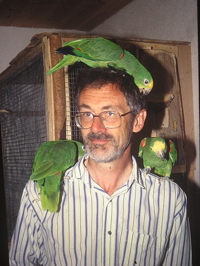 Das Bild links dokumentiert meinen ersten Versuch einen Jungvogel in Anwesenheit der Eltern aus der Bruthöhle zu nehmen um ihn an Menschen zu gewöhnen. Haben hier die Vögel nicht volles Vertrauen zu ihrem Halter, kann das mit blutigen Attacken enden. Auch bei dem Weibchen (links im Bild) handelt es sich um eine frühzeitg mit Artgenossen sozialisierte Notfall-Handaufzucht. So gesehen macht Handaufzucht sogar Sinn, denn der Nachwuchs den zahme (handaufgezogene aber richtig sozialisierte) Eltern in Naturbrut aufziehen wird genauso zahm wie seine Eltern (und spart nebenbei dem Züchter eine Menge Arbeit).