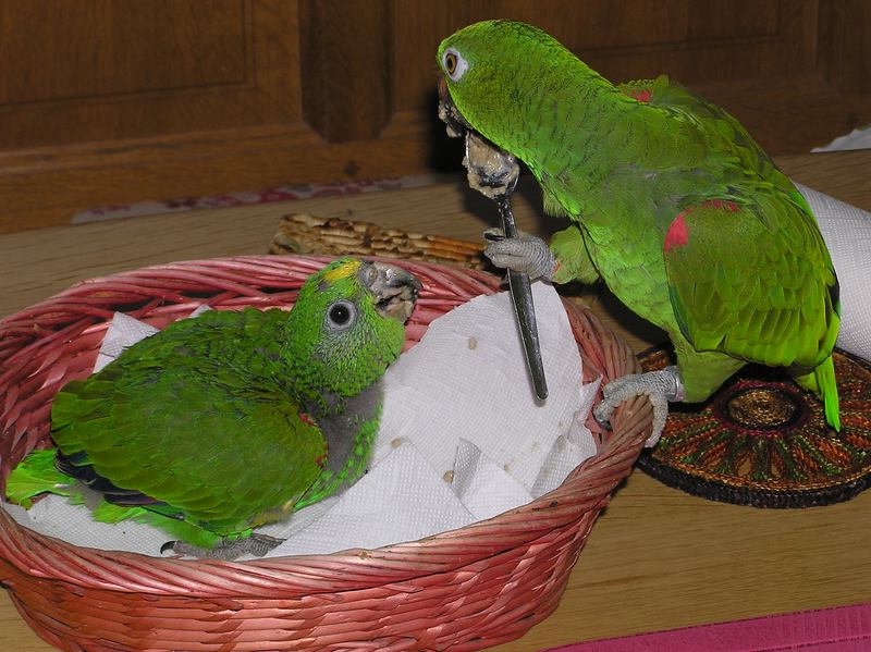 Noch einige Anmerkungen zu den Nachzuchten: Was sich bei Handaufzuchten oft als Hypothek für das ganze Leben erweist, hat natürlich umgekehrt eine lebenslang positive Wirkung, wenn ein Jungvogel richtig aufgezogen und sozialisiert wurde. Denn das, was der Jungvogel während der ersten Lebensjahre lernt, prägt ihn für den Rest des Lebens. Besonders entscheidend sind dabei nach meinen Erfahrungen die ersten Monate nach dem Verlassen der Nisthöhle. Wenn man beispielsweise Jungvögeln in dieser Zeitspanne gezielt beibringt, wie fest sie bei einem Menschen zubeißen dürfen, so kann man davon ausgehen, dass diese Beißhemmung gegenüber Menschen für den Rest des Lebens eingeprägt bleibt. Ich bin jedenfalls noch nie von einer meiner Amazonen, die bei mir aufgewachsen ist, blutig gebissen worden, auch dann nicht, wenn sie geschlechtsreif und in Brutstimmung war.