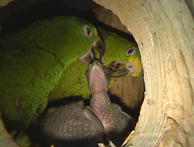werden. Die Eltern (in diesem Fall ein Männchen mit zwei Weibchen, die gemeinsam brüten) kennen das längst. Wie man sieht, sind sie in keiner Weise nervös, im Gegenteil, sie betrachten es sogar als willkommene Abwechslung.